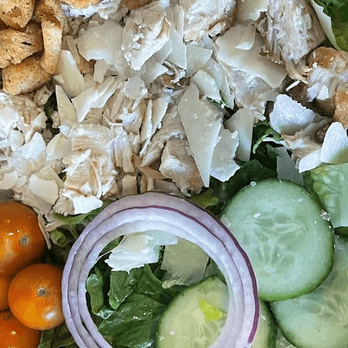 Chicken, parmesan, croutons, tomato, cucumber, red onion