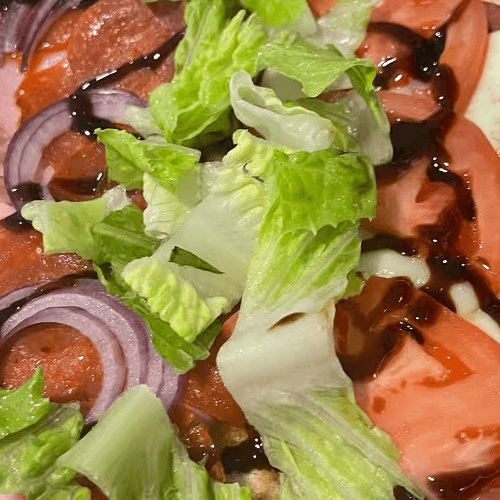 Savor the flavors of pepperoni, ham, capicola, provolone, fresh tomato, crisp onion, and lettuce drizzled with vinaigrette and balsamic glaze in our Big Italy creation