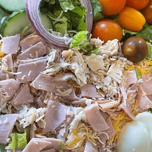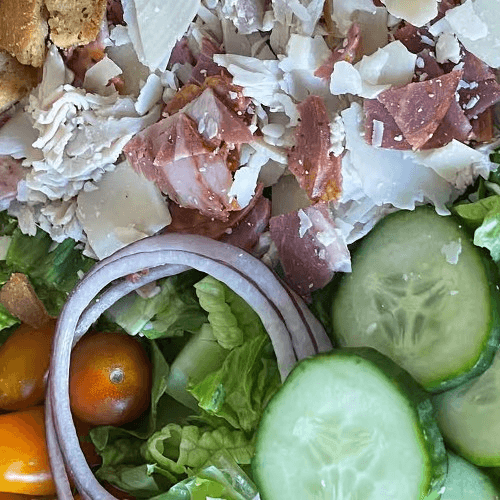 Turkey, pepperoni, capicola, parmesan, croutons, tomato, cucumber, red onion