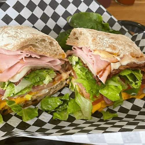 Hearty sandwich with turkey, ham, bacon, cheddar, provolone, tomato, onion, lettuce, and garlic aioli. Satisfying blend of savory flavors and textures in each bite